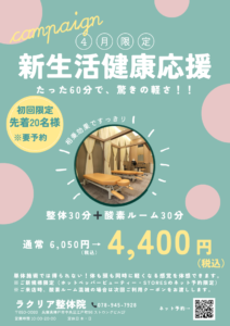こんにちは、ラクリア整体院です。いつもブログをご覧いただきありがとうございます(^^)ラクリア整体院から4月キャンペーンのお知らせです! 新生活が始まる4月は、環境の変化や慣れない生活リズムにより、肩こりや頭痛、全身の疲 […]